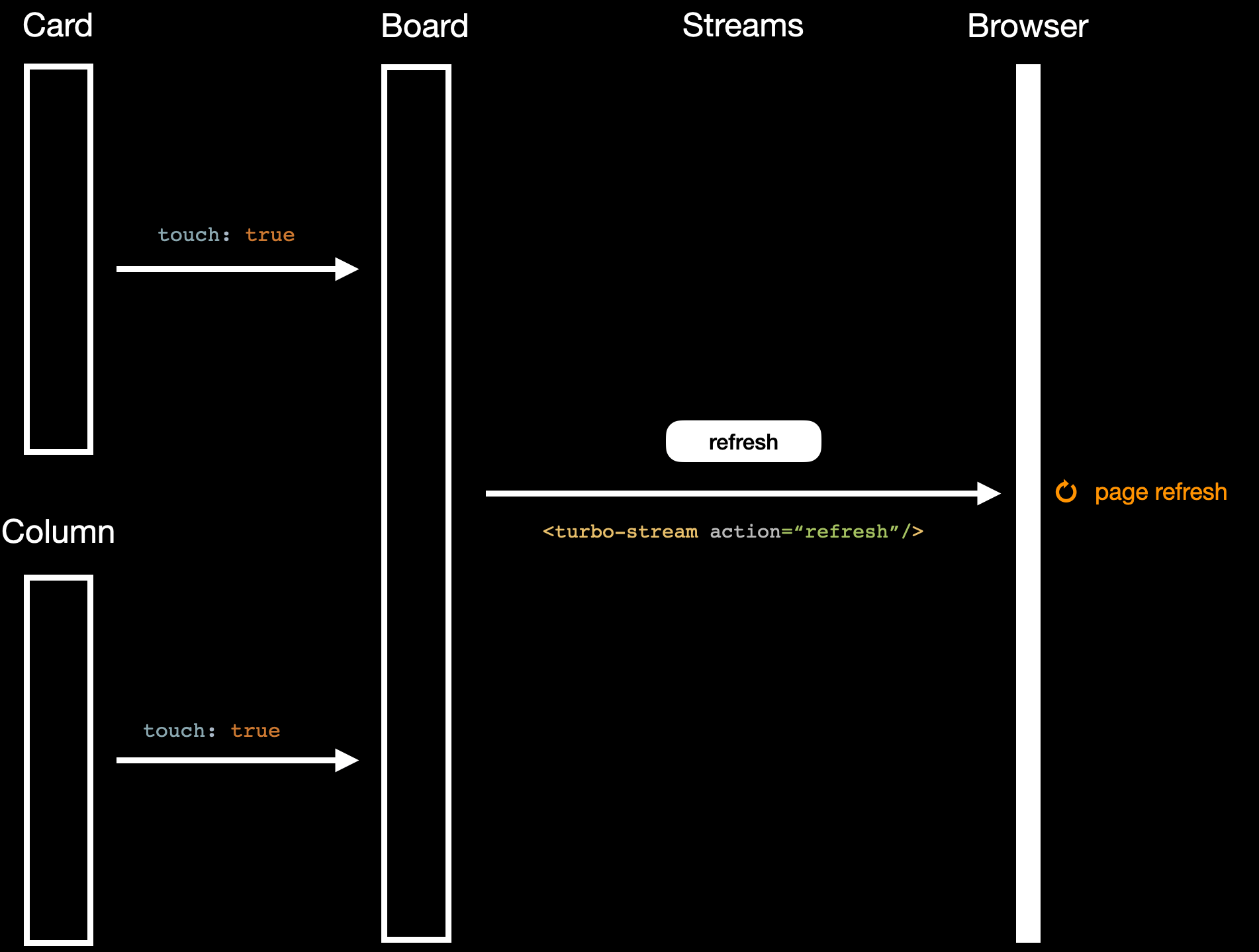Page refreshes offered an excellent opportunity to simplify. We will introduce a new refresh stream action that reloads the page. Models can just broadcast this new action without having to worry about the DOM operations that reflect the change.
