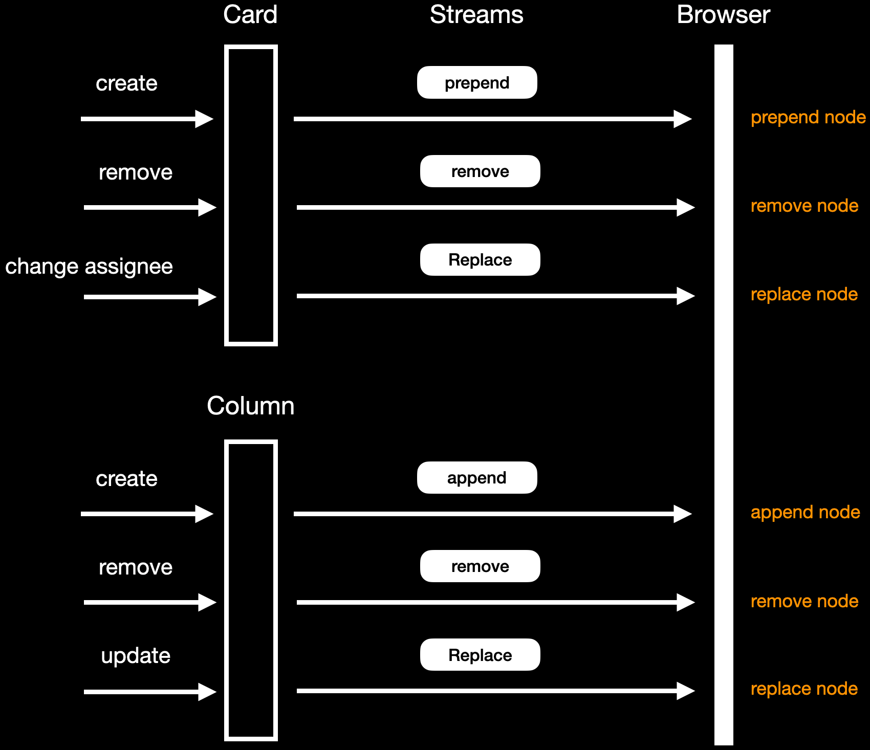 As you can see, every domain change broadcasts a specific DOM operation to reflect the change in the page.