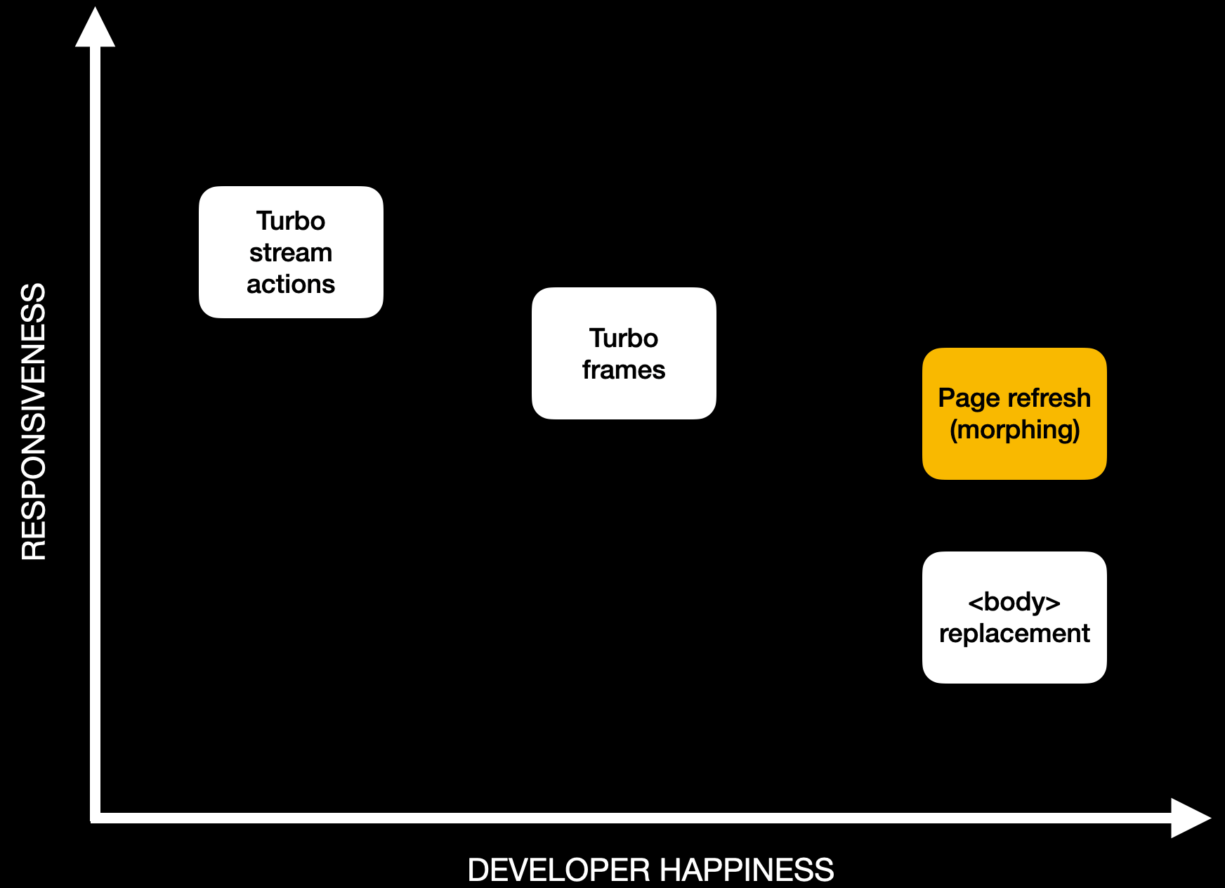 Our goal with the new system is to widen the happy programming path in Turbo based on full-page responses. We want to give you fewer reasons to abandon it, just like the original Turbolinks idea of replacing the body of the page did. The new system won’t deprecate Turbo streams because those still offer higher fidelity, but it should make them rarer.