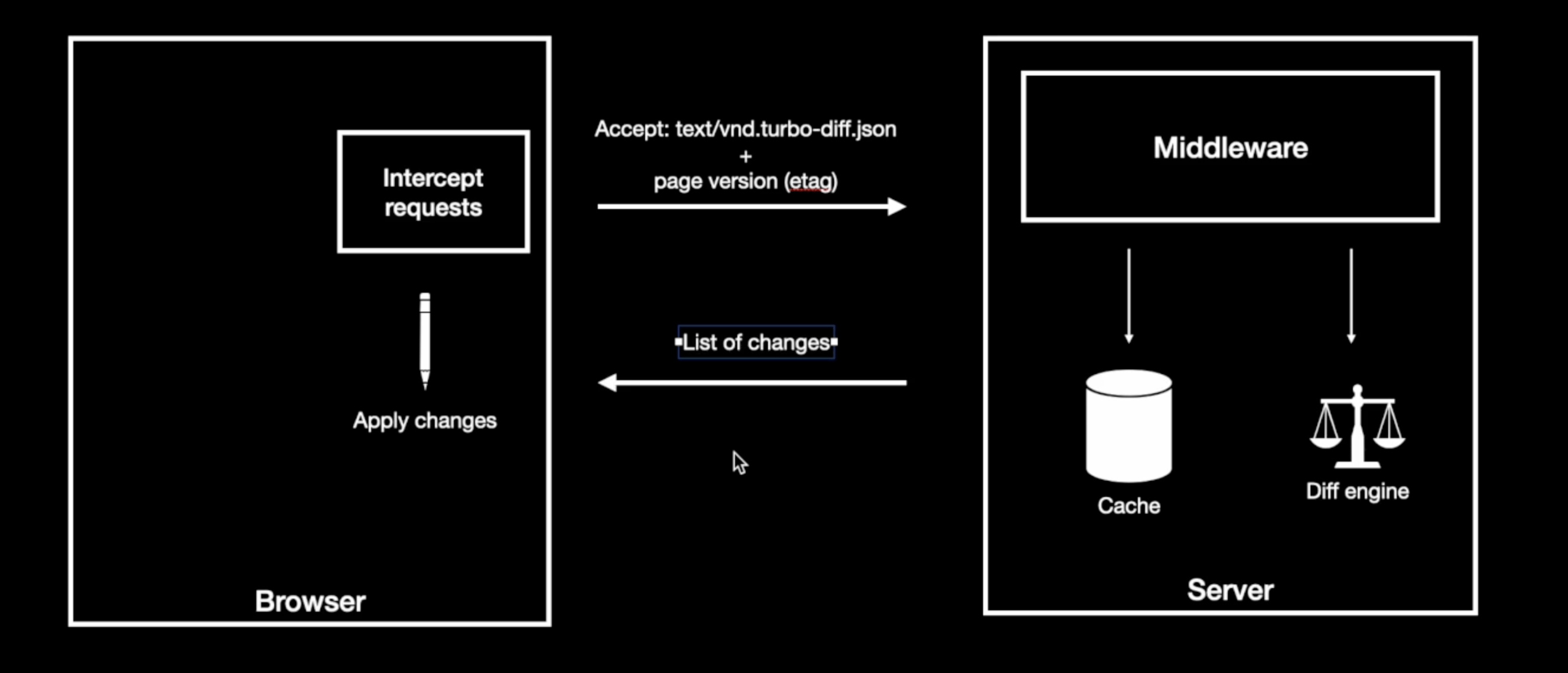 The prototype consisted of a Rails middleware that intercepted requests accepting a special mime type text/vnd.turbo-diff.json. The middleware relies on a diff engine to calculate the diff to serve. When the page contents are cached for a given session, the middleware seamlessly intercepts the response, calculates the diff, and serves it.