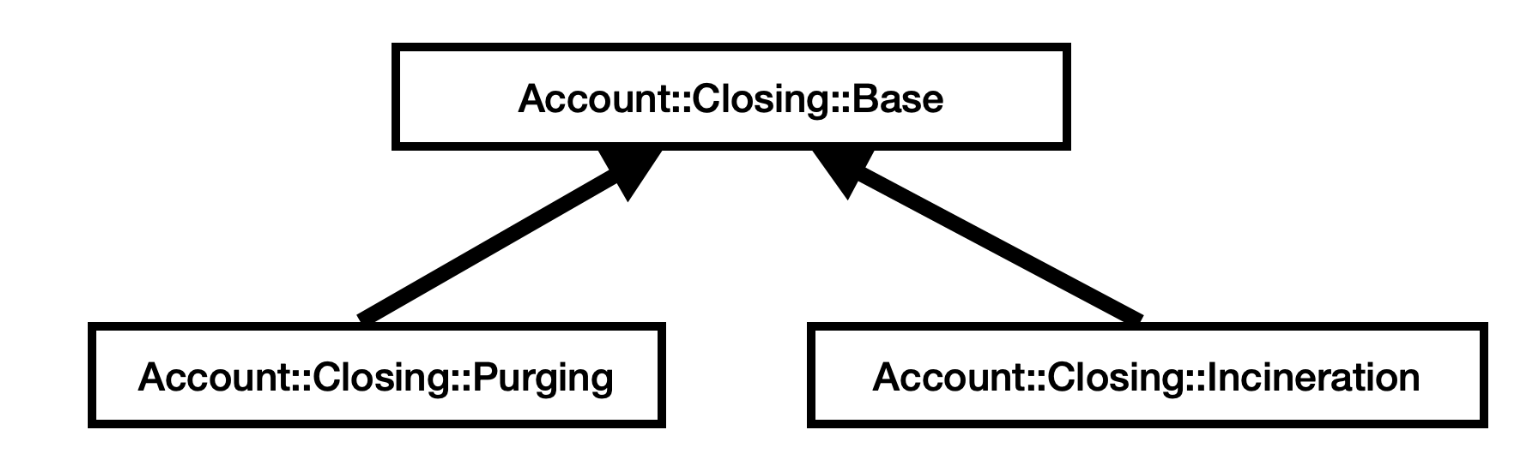And notice that we don’t have a fat Account model responsible for dealing with all the logic of incinerating or purging accounts. There is a subsystem of three classes in charge of that, and the Account model offers just the door to use it.