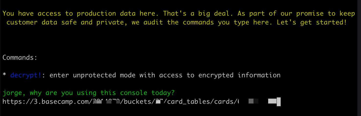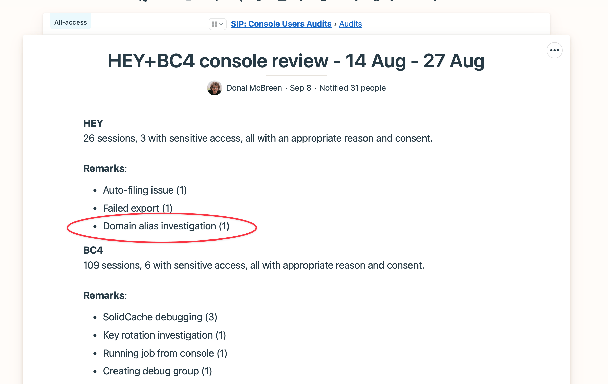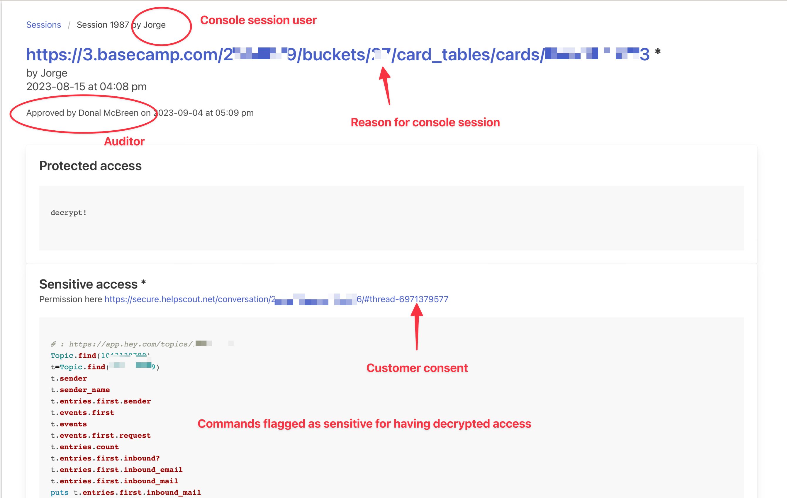 Every two weeks, console auditors summarize how console audits went in a Basecamp project called SIP: Console user audits. This is the one that Donal wrote. My session appears in the group of three HEY sessions that accessed decrypted data during that period.