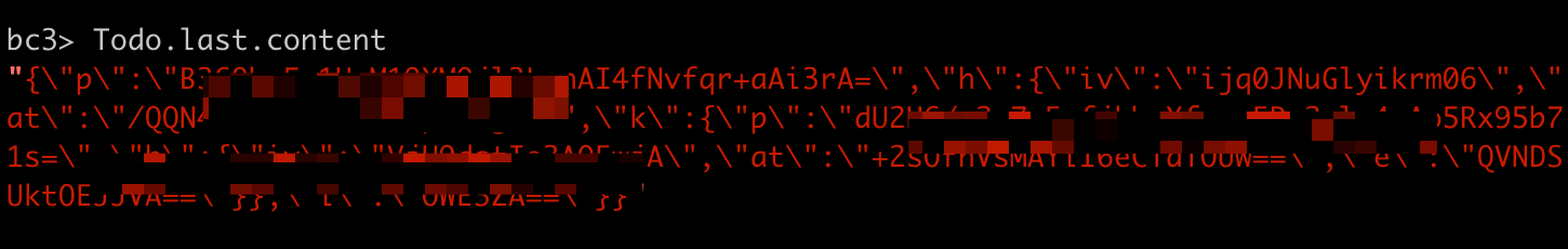 By default, in console sessions, personal information is encrypted. This is fine for most problems, and it prevents programmers from seeing personal information unintentionally while troubleshooting. For example, this is what I would see right now if I printed the last Todo created in Basecamp 4: