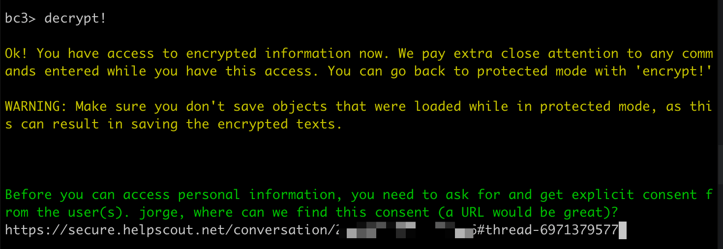 A few weeks ago, I was On-call and worked on a tricky HEY support ticket that involved email aliases. After some back and forth, I realized I needed access to some email addresses we stored in the database. Those are encrypted since they are personal information, so I reached out to the customer to ask for access permission: